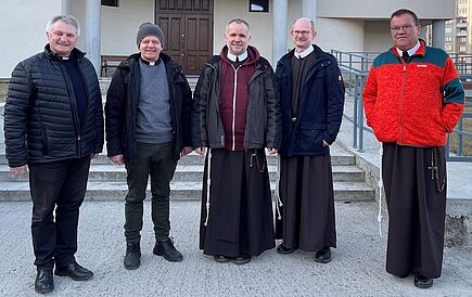 Franziskanerbrüder vom Heiligen KreuzDie Franziskanerbrüder vom Heiligen Kreuz unterstützen Pfarrer Mykola Leskiv (2. v. l.) bei seiner vielfältigen Hilfe für die vom Krieg betroffenen Menschen.