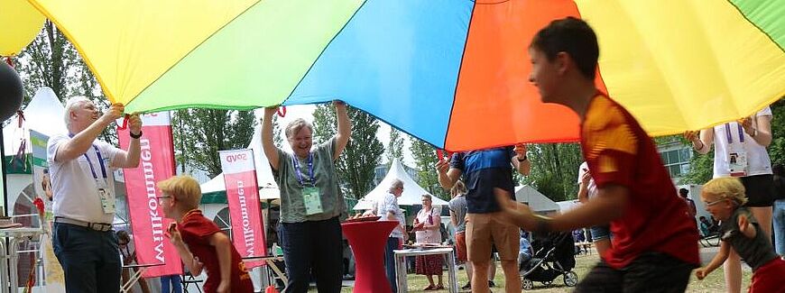 Sr. Thekla Schönfeld MMSSr. Monika Ballani MMS (links mittig im Hintergrund) im Zusammenspiel mit Teilnehmern und Teilnehmerinnen am Stand „Kirche und Sport“