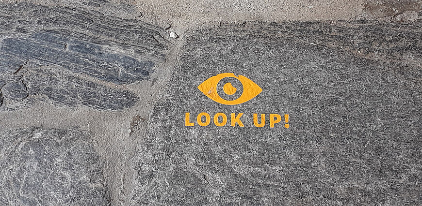 Urlaub in Südtirol. Im Kreuzgang des Klosters Neustift in Südtirol entdeckte ich eine Bodenplatte, die anders war als die anderen Platten. Zwei Worte in englischer Sprache und ein gemaltes Auge fielen mir auf. „Look up!“ Schau auf! Schau nach oben! Das tat ich dann auch und entdeckte im Gewölbe des Kreuzgangs ein besonders sehenswertes Fresko. Jemand hatte mir mit dem Boden-Impuls „Schau auf!“ geholfen, etwas über mir wahrzunehmen, das ich sonst vielleicht übersehen hätte.