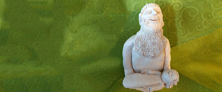 Im „inneren Frieden“ leben zu können und zu dürfen ist auch ein großes Geschenk und nicht selbstverständlich, auch wenn es im Land keinen Krieg gibt. Es ist und bleibt eine Lebensaufgabe, im übertragenen Sinn, das „Kind in uns, in die Arme zu nehmen“ und anzunehmen und vertrauend, hoffend, liebend, wahrhaftig, erwartend. Und das sind Haltungen, um sich beschenken lassen zu können.Der „greise Simeon“ oder mehr der „weise“ Simeon vermittelt mir – obwohl das Kind unübersehbar in seinen Händen ist, ein inneres Beschenkt sein und Glück. Als ich die Figur formte dachte ich auch mehr an diesen Frieden in uns und das nicht nur im „greisen Alter, sondern als Lebenselixier.“
