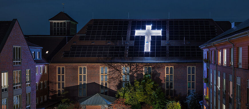 Wer heute auf die Südseite der Mutterhauskirche schaut, sieht inmitten der blauschimmernden Solarpanelen tagsüber ein unauffälliges Kreuz in der Dachbedeckung. Aber im Dunkeln und nachts, wenn wir umfassend der Dunkelheit ausgeliefert sind, dann leuchten die Ränder des tagsüber so unscheinbaren Kreuzes auf. Die Techniker hatten – theologisch irgendwie pfiffig – einen kleinen Teil der am Tage gewonnenen Sonnenenergie in die nächtliche Beleuchtung des Dachkreuzes investiert. So wird, wenn es dunkel, todesdunkel oder „zappenduster“ um uns ist, das Kreuz Christi, die letzte hoffnungsvolle Lichtquelle für uns und unser Leben ein- und aufleuchtend sichtbar.