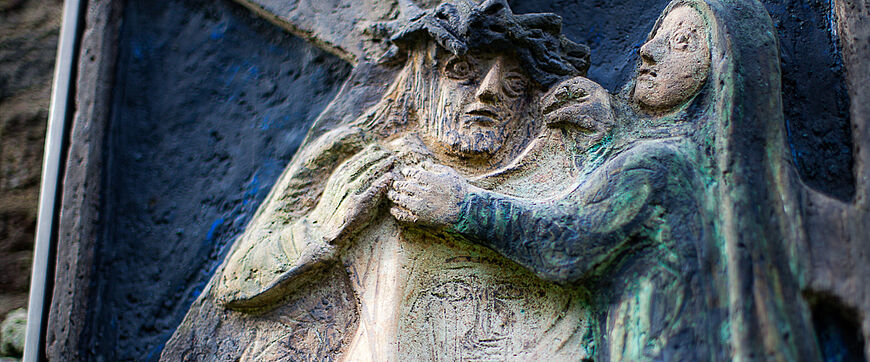 Mich berührt in diesen Wochen die Gestalt der Veronika, wie sie uns in der sechsten Station gezeigt wird. Sie steht mitten im Ausbruch von Gewalt und Lüge, hört die um sich schreienden Menschen, die Jesus ihre Verachtung in unterschiedlicher Weise ausdrücken. Sie sieht Jesus, den die Schmerzen, die Schläge und das Blut zu einer abstoßenden Gestalt machen, vor der man Ekel und Schrecken empfand.