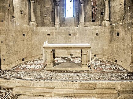 Espirat, CCA-SA 4.0. wikimediaDie Klosterkirche ist von einem bedeutenden romanischen Bodenmosaik geschmückt. Es wurde um das Jahr 1124 geschaffen und erstreckt sich heute über eine Fläche von 72 Quadratmetern, ursprünglich sogar 82 Quadratmeter. Das Mosaik, das in der Apsis der Kirche liegt, wurde aus farbigem Marmor und Kalkstein gefertigt und zeigt eine Mischung aus christlichen Symbolen und fantastischen Kreaturen: Ritter kämpfen gegen Fabelwesen, und Motive wie der heilige Georg, der den Drachen besiegt, stehen für den Triumph des Guten über das Böse. Das Mosaik wurde im 19. Jahrhundert wiederentdeckt und restauriert und gilt als bemerkenswertes Zeugnis mittelalterlicher Kunst.